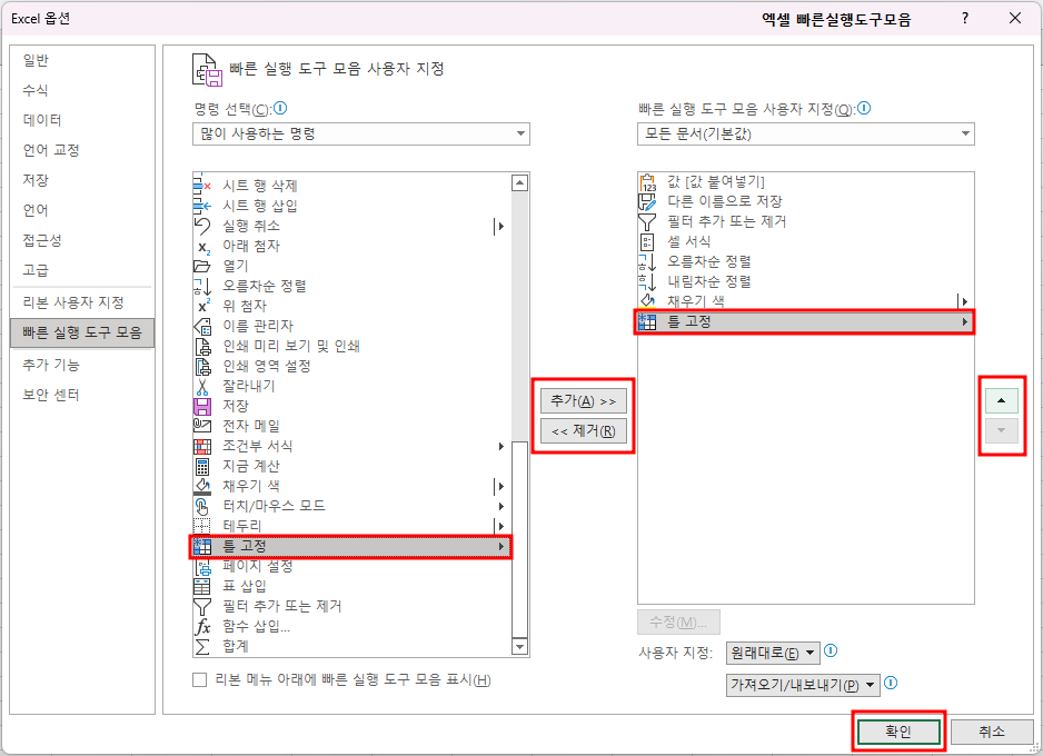 등록된 빠른실행도구모음 중 순서를 바꾸고자 한다면 해당 기능을 클릭한 후 우측에 있는 방향키로 조정하여 순서를 변경할 수 있습니다.